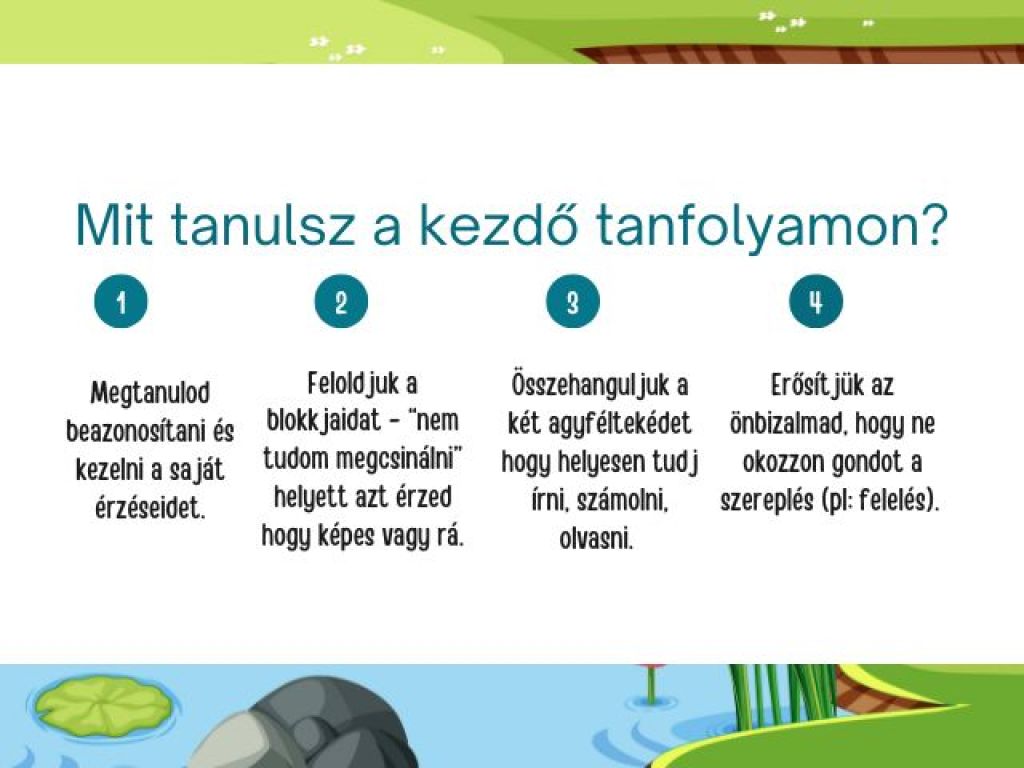 Ez a tanfolyam nem csak a tanulásról szól. Arról szól, hogyan érezzék jól magukat a saját bőrükben, hogyan legyenek bátrak, és hogyan vegyék az akadályokat könnyedén.